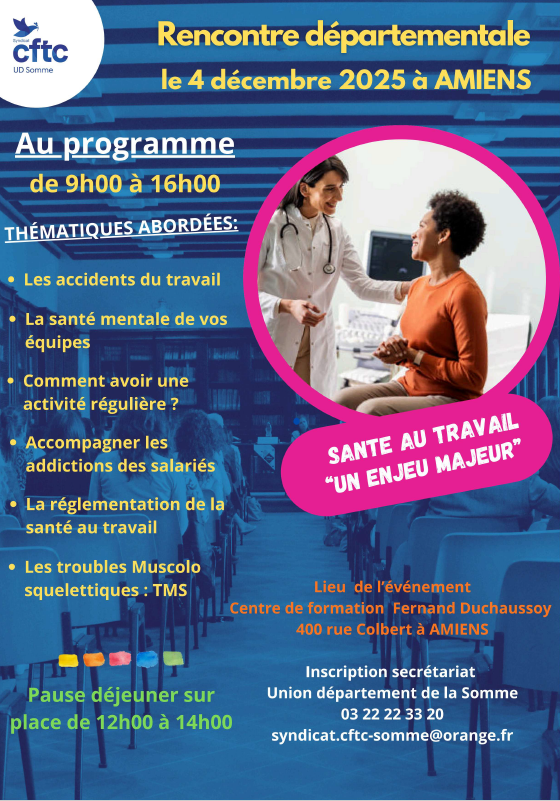 La CFTC de la SOMME vous invite à participer à sa rencontre départementale sur le thème de LA SANTE AU TRAVAIL.